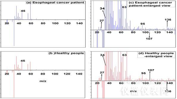 研究人员发现7种呼吸质谱离子能区分健康人士和食管癌患者,敏感性和特异性分别为86.2%和89.5%。这7种呼吸质谱离子分别是 m/z 136、m/z 34、m/z 63、m/z 27、m/z 95、m/z 107 和 m/z 45。与健康人相比,食管癌患者呼气质谱分析中有5种质谱离子的中位强度(mediant intensities,编者自译)降低,剩余2个质谱离子的中位强度增加。ROC曲线下面积为0.943。