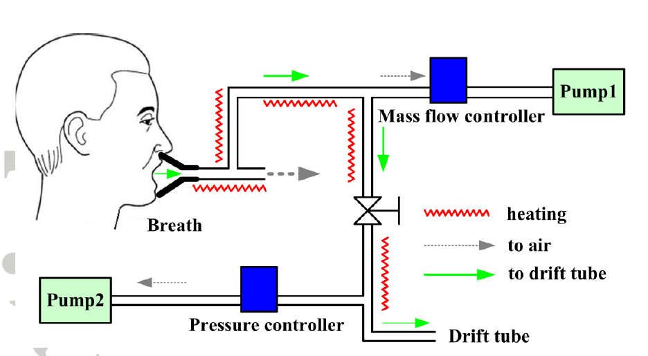 以往的呼气检测研究大多数沿用采样袋呼气取样与色谱质谱离线分析方法,该方法潜在问题是:采样袋易引起呼气成份污染、甚至丢失,色谱质谱分析需要约2个小时。因为质控困难、过程繁琐以及分析速度慢,这种方法难以满足筛查对快速检测的要求。
