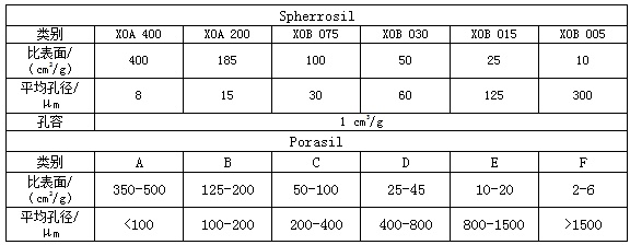 气相色谱发展早期,硅胶可以用作气-固色谱的固定相,也可以用作气-液色谱的载体,由于硅胶制作工艺、原料表面积及孔径的不同,其分离性能有很大的差别,为此厂家进行了标准化的分级,有不同品牌和规格的色谱用硅胶,下表是Rhone- Progil 公司生产的球型多孔硅胶,而Waters公司又把其中的 Porasil 进一步筛分成不同粒度的产品。