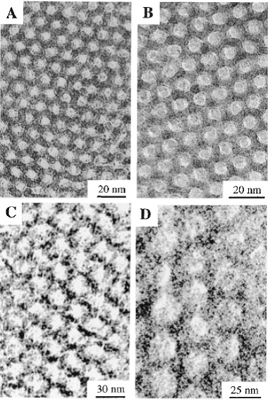但是近年来由于介孔分子筛的出现,把分子筛的孔径提高到30nm,为分子筛的应用扩大了范围。1992年,Kresge等首次利用烷基季铵盐阳离子作为表面活性剂,合成了介孔分子筛如 MCM-41,此类介孔分子筛的比表面积大、孔径均一、孔径可调等特点,突破了微孔材料(如沸石)的孔径限制,在催化分离等方面有广阔的应用前景。但是由于 MCM-41 有孔径较小、孔壁较薄、水热稳定性及化学稳定性较差等缺点,使其应用受到很大的限制。1998年在美国加州大学圣芭芭拉分校作博士后研究的赵东元等(现在是复旦大学教授,院士)用亲水的三嵌段共聚物聚环氧乙烷-聚环氧丙烷-聚环氧乙烷(即P123)制备了有序二维六方相介孔分子筛 SBA-15(SBA 是Santa Barbara Amorphous[圣芭芭拉多孔]的字头),其壁厚可达6.4nm,孔径可达30nm,并且具有较高的水热性能(100℃,50h)。SBA-15不仅弥补了MCM-41水热性能方面的不足,而且三嵌段共聚物具有可生物降解、无毒、价廉等特点,满足了环保和经济发展的需求,成为近年来的研究热点之一,在催化、吸附、分离、纳米组装、生物医药和传感等方面得到了广泛的应用。下图是SBA-15不同孔径的结构图(文献来源:赵东元等. Science ,1998,279:548; 宗蒙,黄英,赵阳,材料导报A:综述篇,2012,26(9):54-59)
