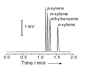 由于MOFs不容易涂渍在毛细管壁上。南开大学严秀平研究组用动态法把纳米级MOF-101涂渍在15m长的大内径(0.53mm)石英毛细管柱上,使最难分离的二甲苯三个位置异构体得到十分漂亮的基线分离,并用于多种混合物的分离上。