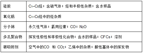在上世纪后半页用于气-固色谱的吸附剂有硅胶、活性碳、氧化铝、分子筛、石墨化炭黑、碳分子筛、多孔聚合物等,这些吸附剂可以作填充柱的固定相,也可以填充或涂渍到玻璃、金属或弹性石英毛细管中。这些吸附剂的用途如表 1 所示。
