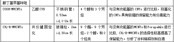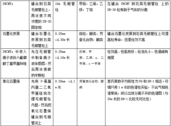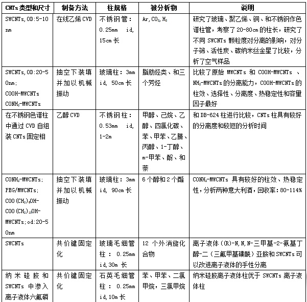 炭、石墨化碳黑(Carbopack B)柱进行比较,比较它们分离醇、酮、醚、酯、有机酸类的性能。2005年 Mitra等首次把自组装碳纳米管使用化学蒸汽沉积(CVD)方法涂渍在长的毛细管色谱柱中,得到高的柱效,改变CVD条件会改变CNTs膜的厚度和形态,因而可调整色谱的选择性。2006年 Mitra 等又利用鈷和鉬盐进行催化的化学蒸汽沉积方法吧单壁CNTs涂渍在毛细管色谱柱中,厚度达300nm,柱效可达每米1000理论塔板数,测试其麦氏常数属非极性固定相。同年国内袁黎明研究组把单壁CNTs和离子液体组成混合气相色谱固定相,制备成毛细管色谱柱,CNTs可以改善离子液体的分离性能。此后有两年停滞,从2008年又有一些研究报告出现。到近5年CNTs作气相色谱固定相的研究又多起来,下表4列出2008年至今发表的一些有关CNTs作气相色谱固定相的研究的工作。