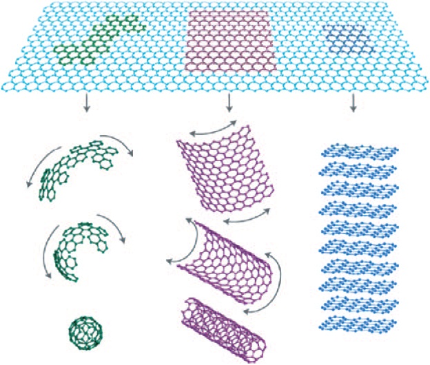 自从1991年日本学者饭岛澄男(Sumio Iijima)发现了碳纳米管(CNTs)之后,改变了人们过去对碳的三种形态(金刚石、石墨和无定形碳)的认识,对碳纳米管不断进行研究,并竞相把这种新奇的材料用在各个领域,在2004年又出现了另外一种有趣的碳物质——石墨烯,G),CNTs和G是碳的两种同素异形体,他们具有sp2杂化网络,但是结构不同,CNTs具有管状纳米结构,由石墨烯片卷成管状,形成准一维结构,而G是打开纳米管形成的平面二维薄片。CNTs可分为单壁碳纳米管(SWCNTs)和多壁碳纳米管(MWCNTs),石墨碳家族的各种形态如图5所示。