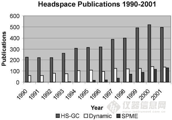 其实顶空进样气相色谱现在是应用非常广泛的一种分析方法,如果你用“顶空进样”这一关键词检索“知网”就会有两千多篇文章;在仪器信息网上的仪器展播中有关顶空进样的仪器有50多种,再看下面一张从1990年到2001年发表的有关顶空气相色谱文章的增长趋势图,12年里发表文章的总数达到4000篇,可见这一方法的应用有多么广阔。