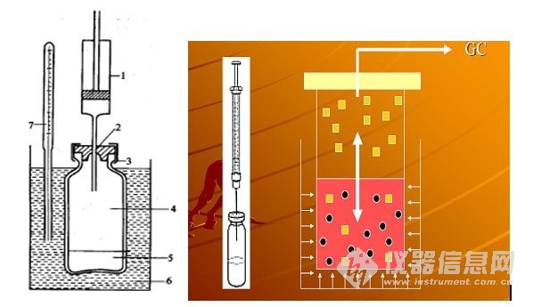 1—注射器; 2—密封隔垫;3—螺帽;4—容器;5—样品;6—恒温浴;7—温度计