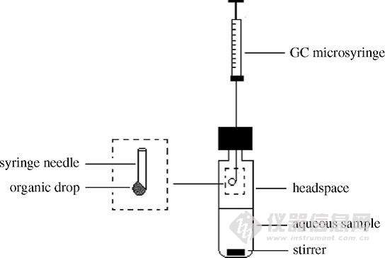 (4)一滴溶剂顶空进样气相色谱:这种进样方式类似于SPME顶空进样,只是把固相微萃取进样装置换成一支注射器,在注射器针头处悬一滴萃取用溶剂液滴,如下图9所示:
