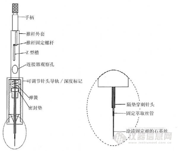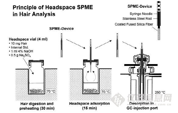 (3)固相微萃取(SPME)顶空气相色谱:这种方法是在静态顶空瓶顶空蒸汽中装一支固相微萃取头,在一定温度下吸附顶空重的蒸汽分子一定时间,然后把固相微萃取头取出,插入气相色谱仪的进样口中,进行气相色谱分析。如下图7所示: