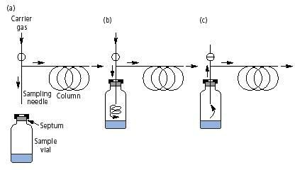 顶空气相色谱进样必须从密闭的样品瓶的顶空取样到气相色谱仪中,要控制取样的重复性是至关重要的,常使用压力平衡进样。所谓平衡压力进样就是使用惰性气体往恒温的密闭样品瓶中加压,然后让受压的顶空气体在一定的时间里膨胀到色谱柱中。依靠控制压力和时间可以很精确地从样品瓶中吸取一定容积的顶空气体样品。这一方法叫做“平衡压力进样” ,平衡压力进样的过程如图 10所示。(a)恒温样品瓶和进样针是分开的,(b) 通入气体加压,(3)关闭载气,顶空瓶中的气体膨胀到色谱柱中。