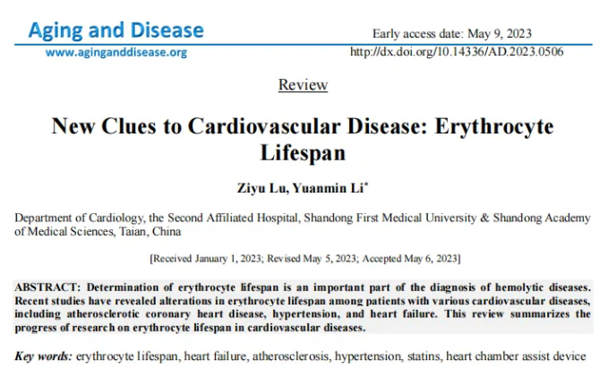 2023年5月,山东第一医科大学第二附属医院心内科在《Aging and Disease》在线发表了题为“New Clues to Cardiovascular Disease: Erythrocyte Lifespan”的综述。